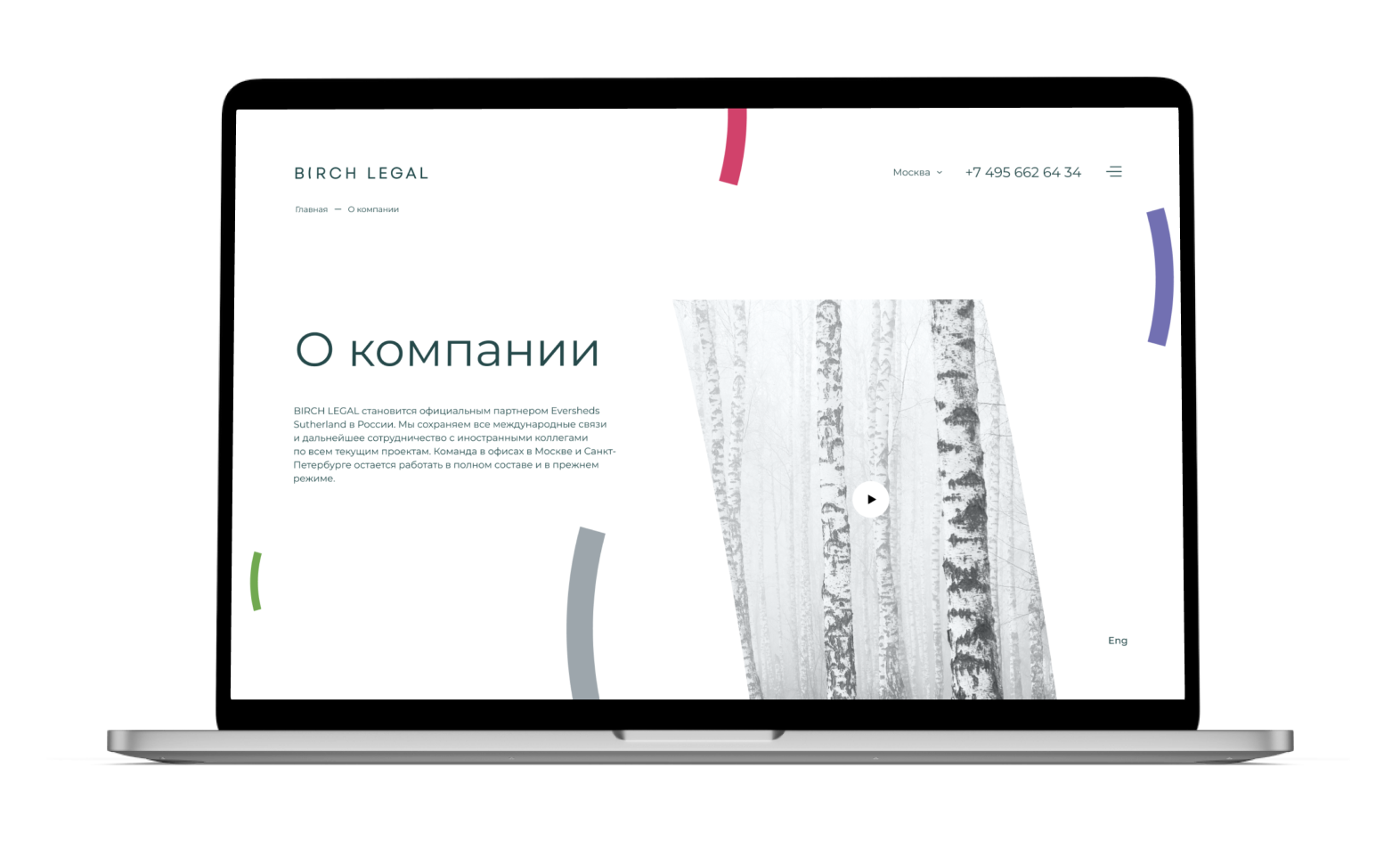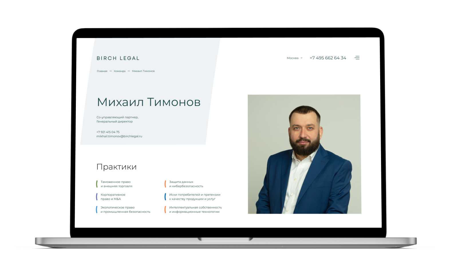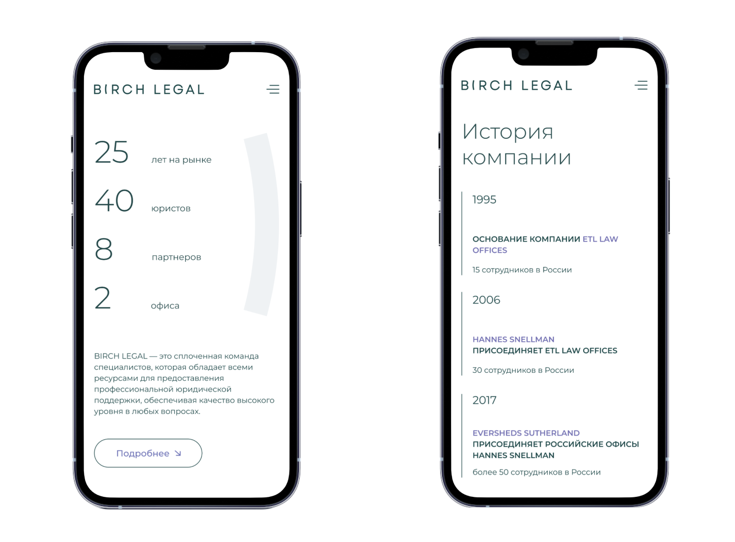 Сайт получился минималистичным, светлым и понятным. Ключевым элементом дизайна является символ ствола березы, который является основным в брендинге компании Birch Legal. Главенствующими используемыми цветами являются различные оттенки серого, а также выбранные на этапе брендинга цвета практик.