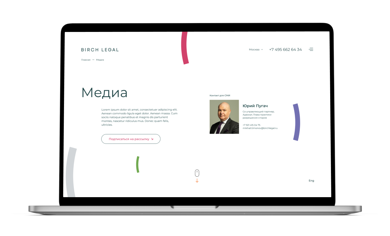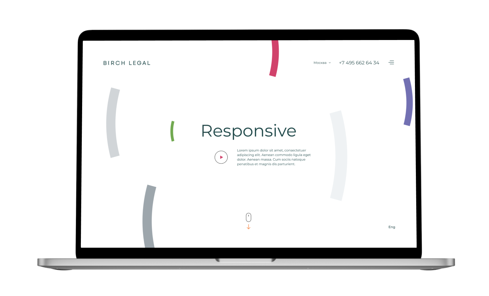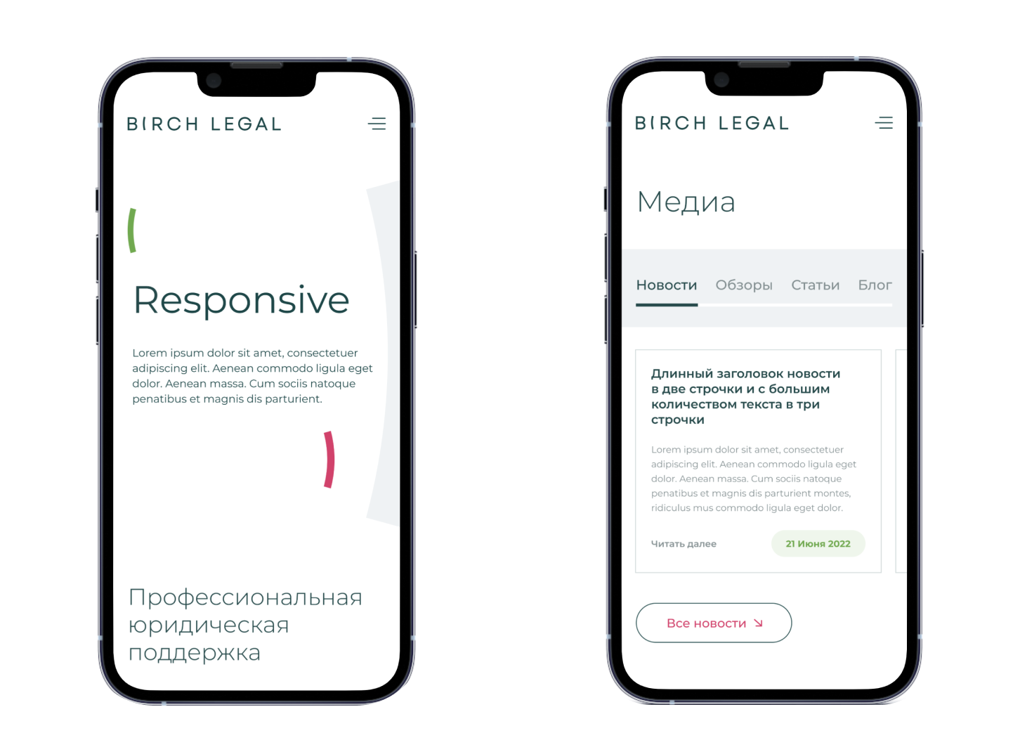 Сайт получился минималистичным, светлым и понятным. Ключевым элементом дизайна является символ ствола березы, который является основным в брендинге компании Birch Legal. Главенствующими используемыми цветами являются различные оттенки серого, а также выбранные на этапе брендинга цвета практик.