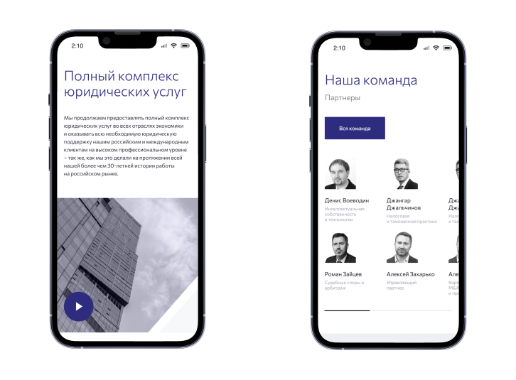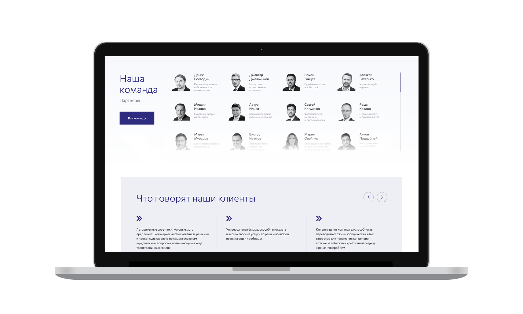 Результатом работы по дизайну нового сайта для юристов является эстетически привлекательный и удобный ресурс, выполненный в строгом стиле, со светлыми тонами и акцентным синим цветом. Он производит на посетителей сайта впечатление надежности, профессионализма и серьезности юридической фирмы.